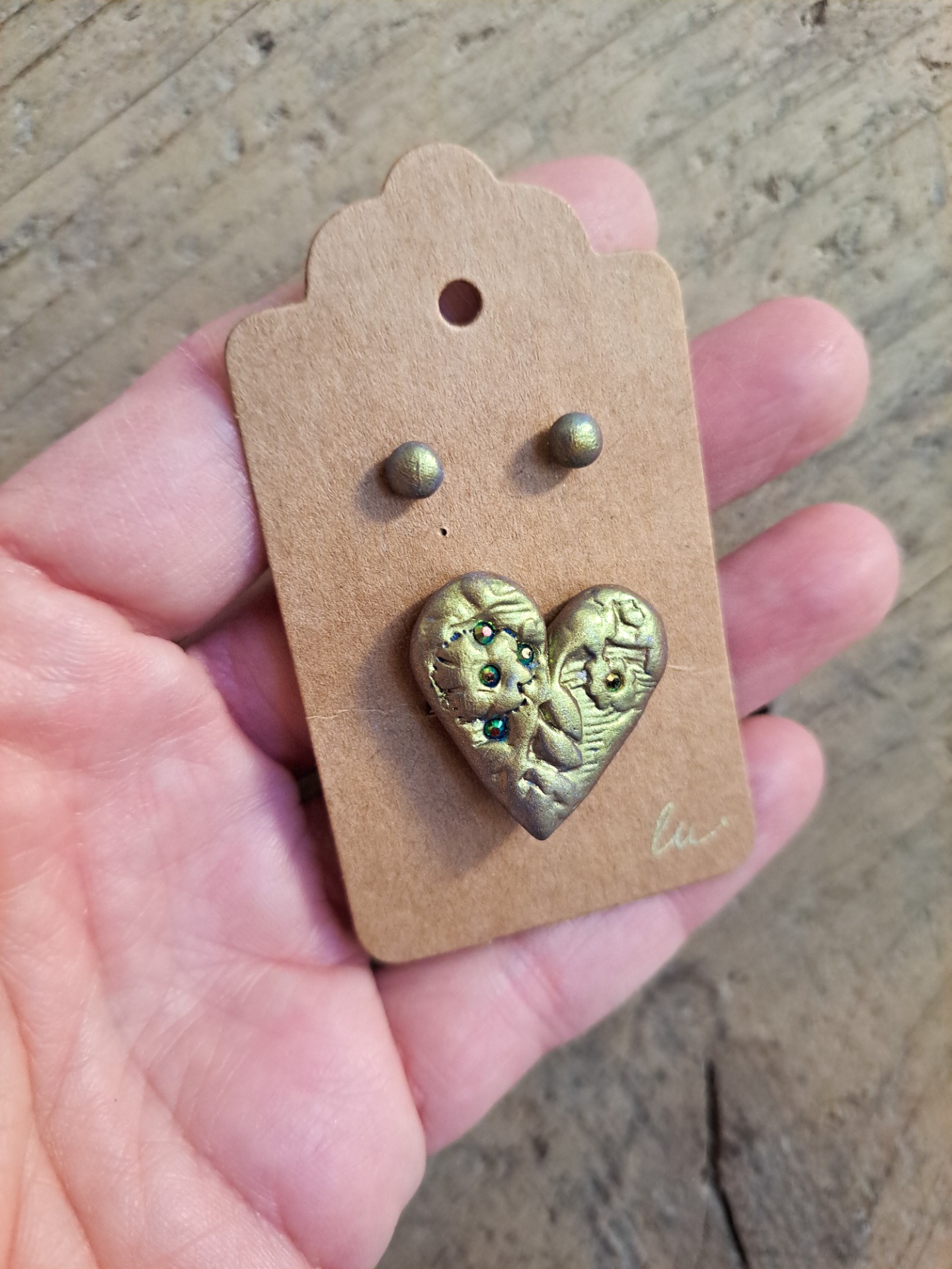 Brož je veliká o průměru 4 cm, ručně vymodelovaná z profesionální hmoty na výrobu šperků, odraz světla zajistí zelené zirkony vsazené do srdce. Zapínání je brožové na špendlík. Náušnice jsou veliké v průměru 5 mm, zapínání je puzeta z chirurgické oceli.