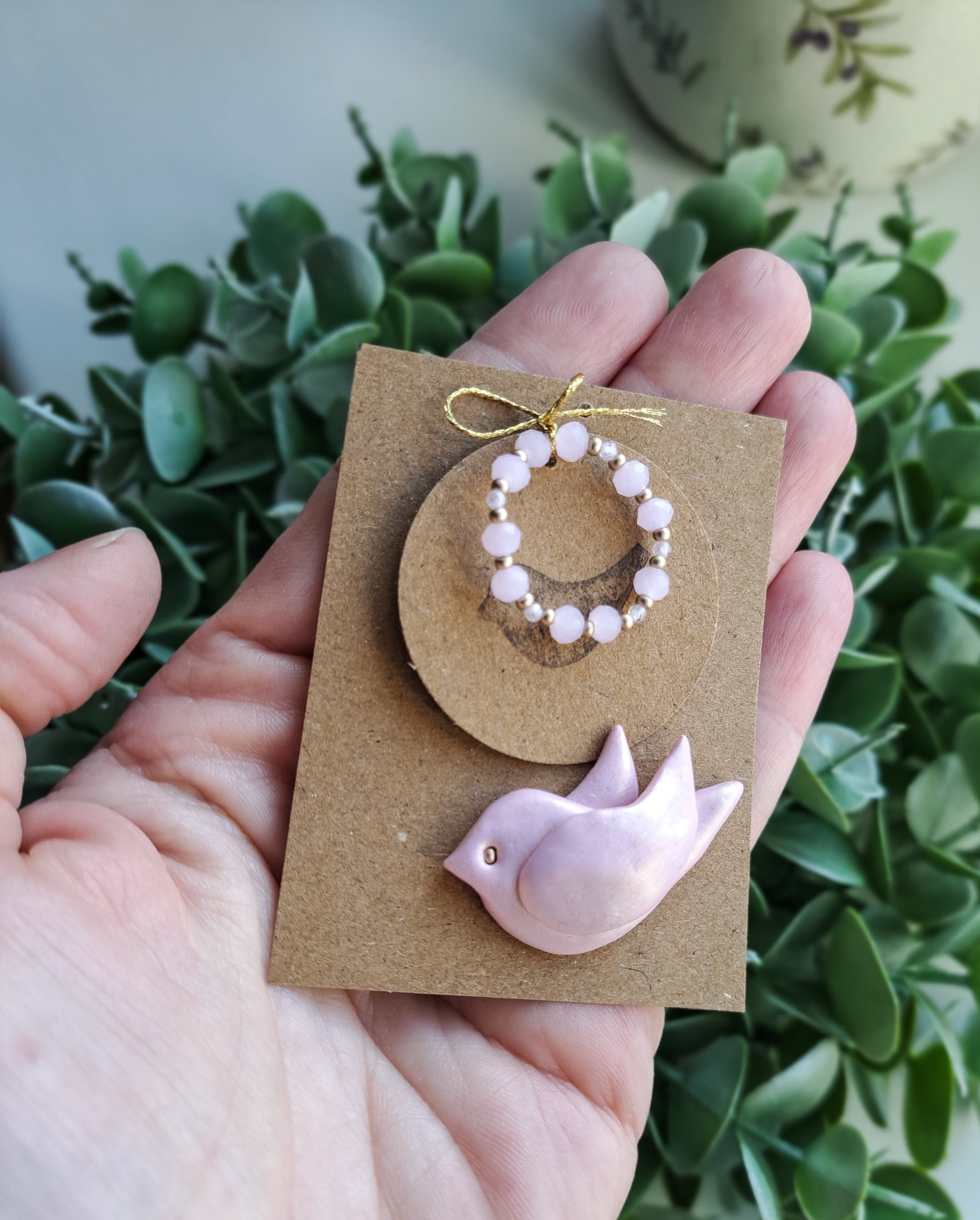 Brož ve tvaru ptáčka symbolizuje nadhled a volnost. Jemně růžová barva s nádechem zlatého prachu dodáva broži néžnost a romantický vzhled, očíčko je ze zlatého korálku, které jsem použila i na kombinaci prstýnku, díky tomu je set originální a ladí. Brožové zapínání, rozměr cca 4 cm. Prstýnek je kombinace fazetované skleněnky a zlatého matného korálku, které jsou navlečené na průžném lanku. Velikost prstýnku uveďte v poznámce. Skladem jeden kus!
