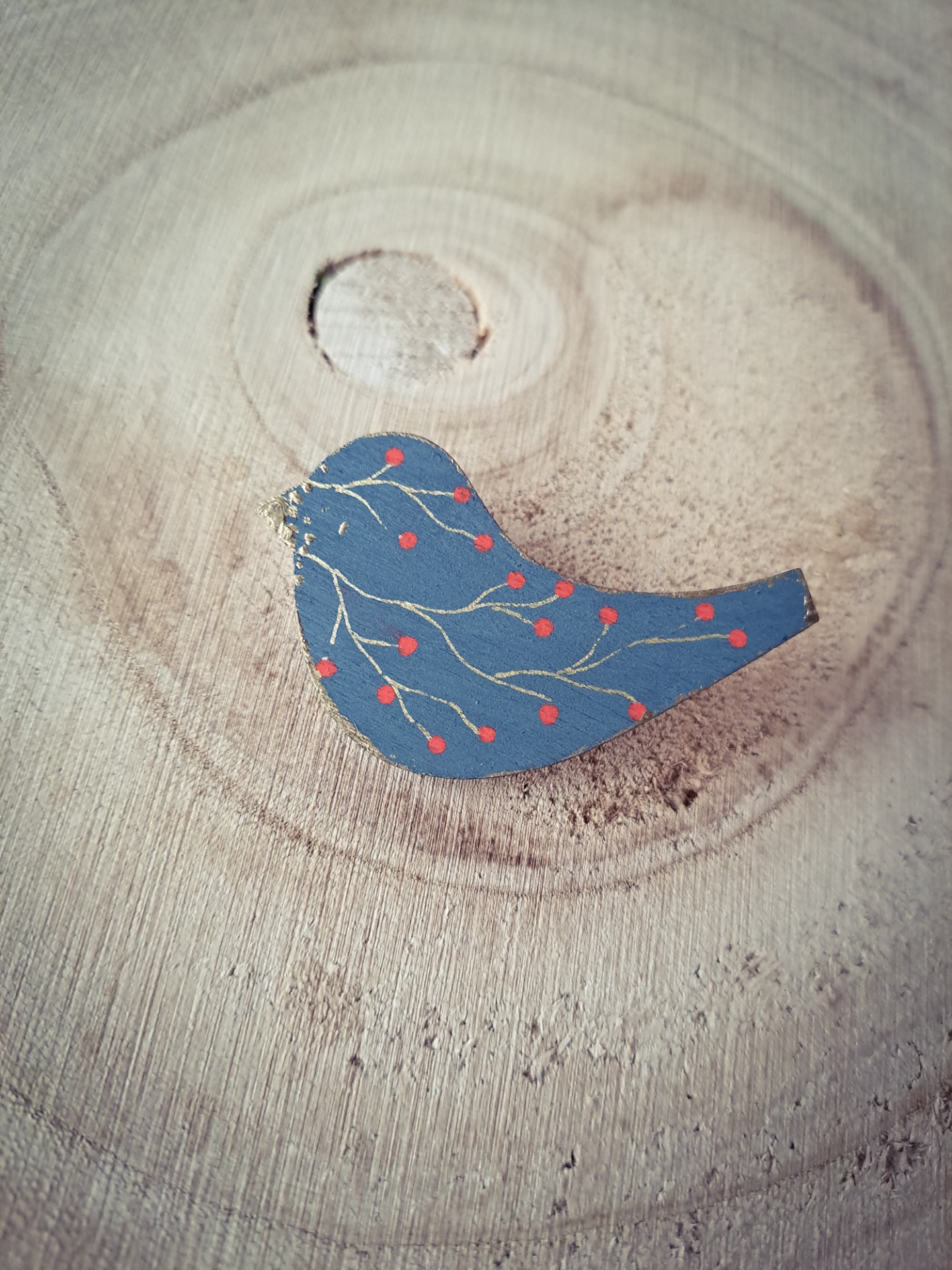 Brož z dubového dřeva v modré barvě s decentním ručně malovaným vzorem. Velikost ptáčka jsou 4 cm, zapínání je brožové. Vhodný doplňek na kabát, svetr, šáku, kabelku, batoh nebo jako dárek se symbolem nadhledu a volnosti. Skladem jeden kus!