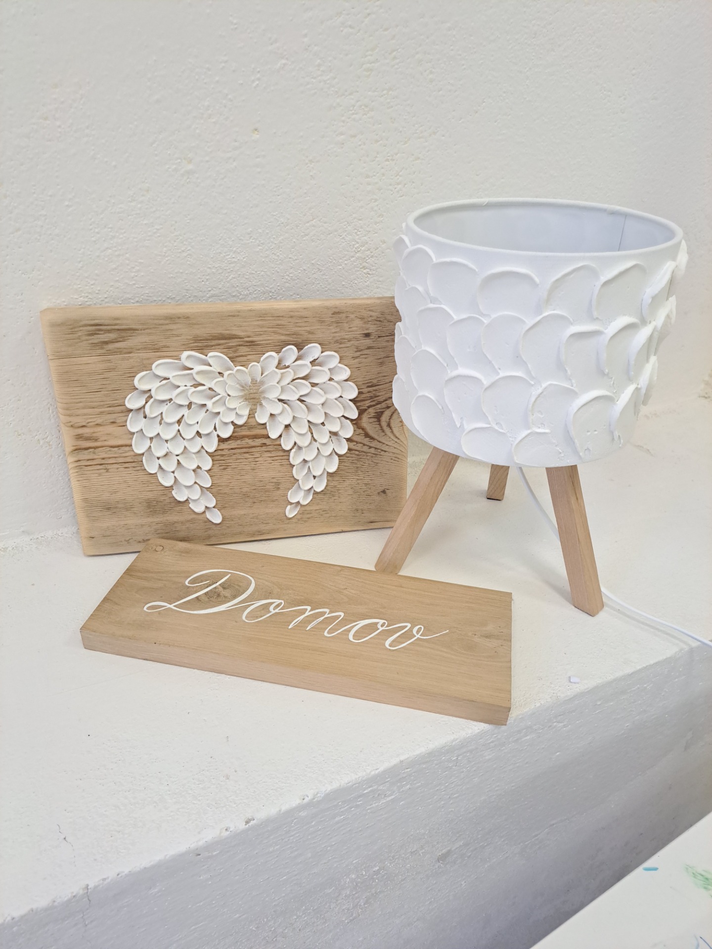 Křídla jsou v bílé barvě, tvořená plastickou hmotou na dřevěném podkladě u kterého jsem zanechala přírodní vzhled a díky této kombinaci materiálů působí velice přirozeně. Rozměr 24x 17 cm, ruční práce. OBRÁZEK LZE ZAVĚSIT!  V JEDNODUCHOSTI JE KRÁSA.