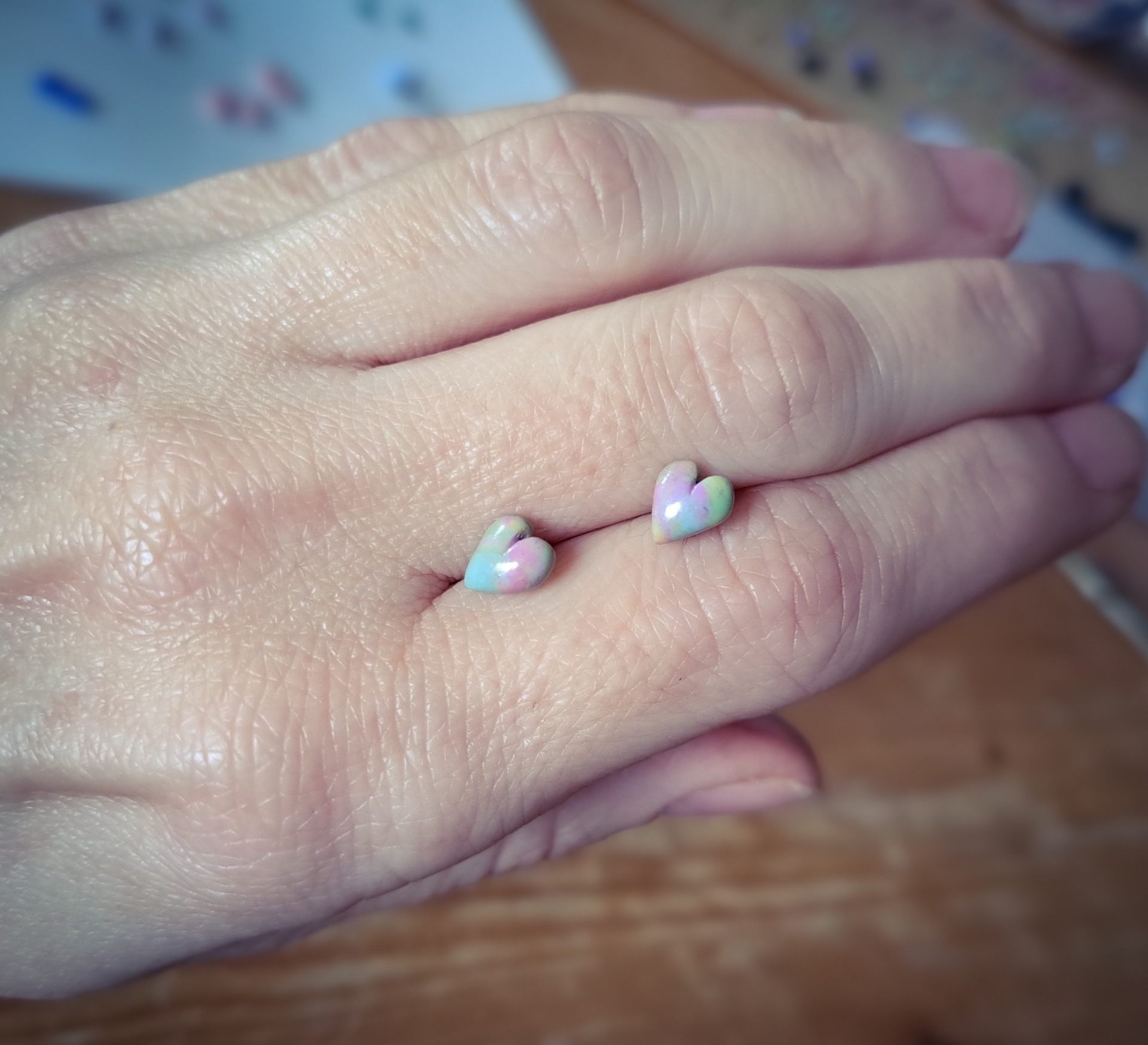 Náušnice jsou ručně modelované z italské hmoty na výrobu šperků, zapínání je na puzetu z chirurgické oceli, velikost náušnic 5- 7 mm, barva náušnic je duhová. Skladem jeden kus!