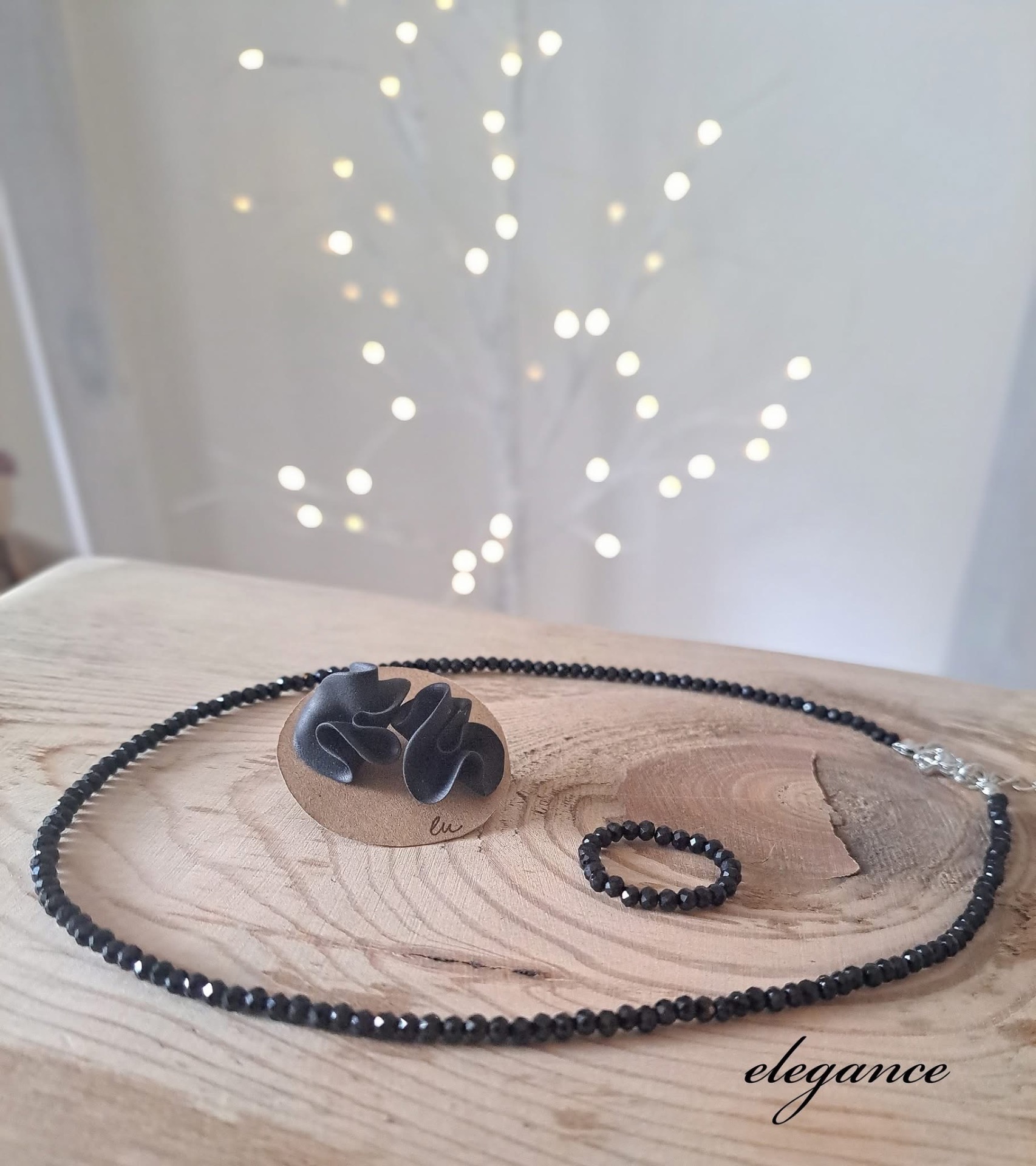 Set černá elegance obsahuje nárdeník z minerálního kamene Obsidián, který ma zapínání z chirurgické oceli, díky fazetovanému minerálu se třpytí na světle. Prstýnek je ze stejného materiálu u rozměru 3 mm. Náušnice jsou ručně modelované z hmoty na výrobu šperků, tvar květu o průměru cca 1 cm.